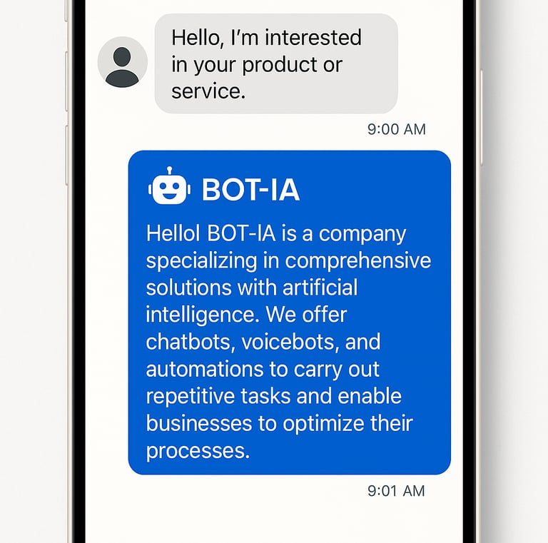 In BOT-IA we create customized chatbots that adapt to your processes. We help you automate with safe, effective and designed solutions to grow your business with innovation and efficiency.
